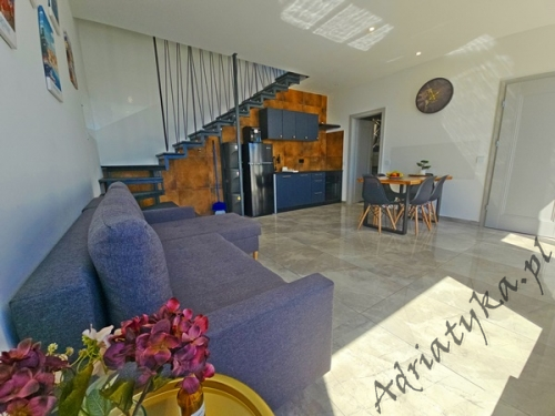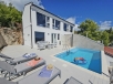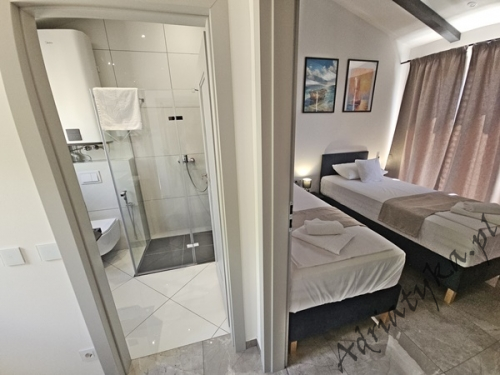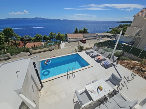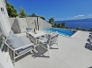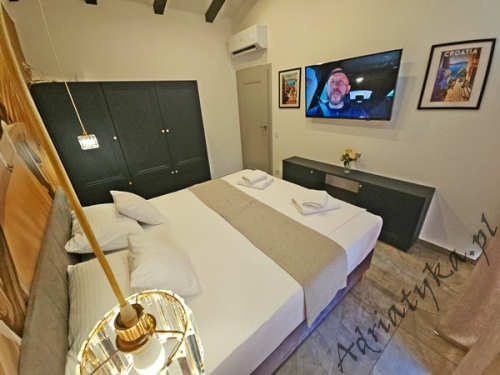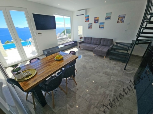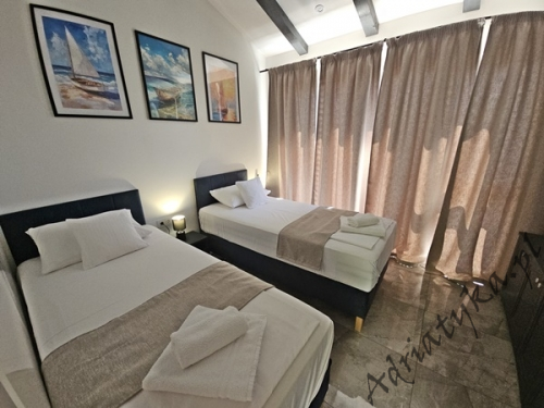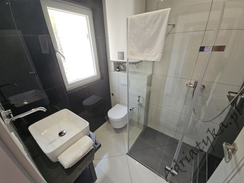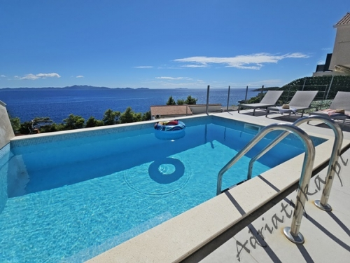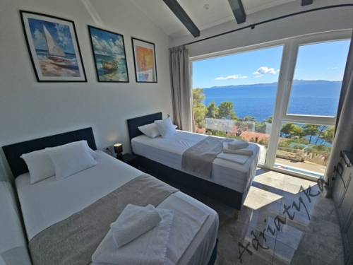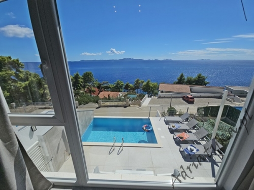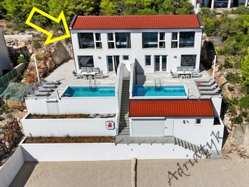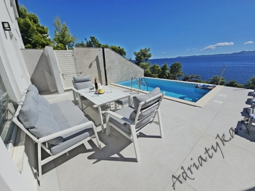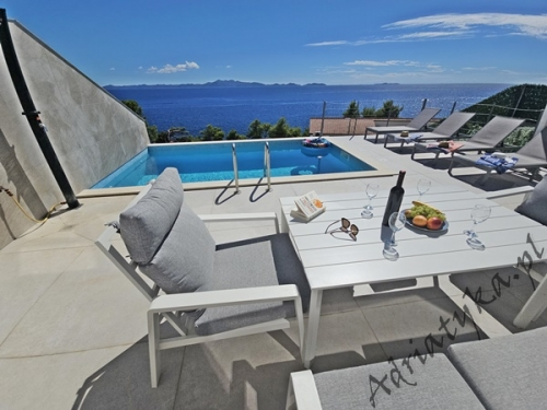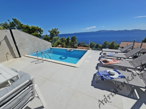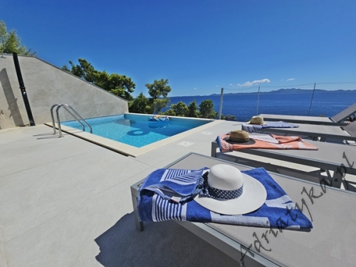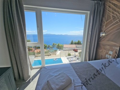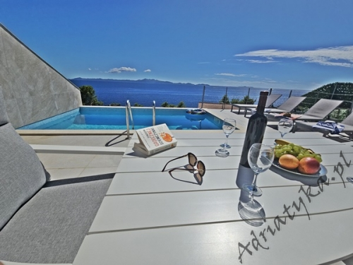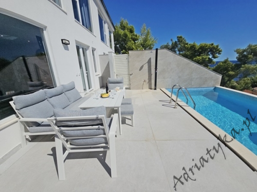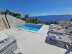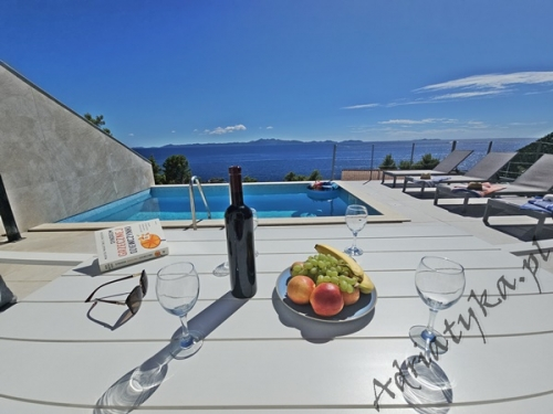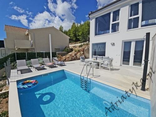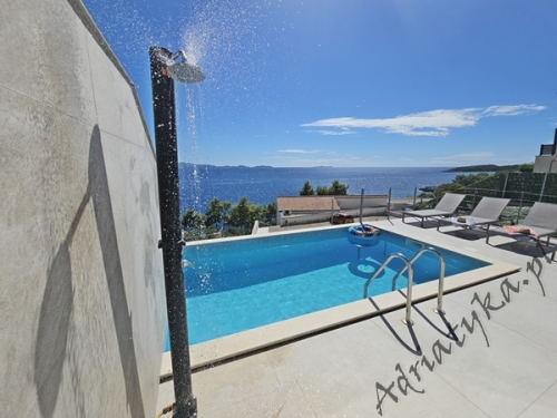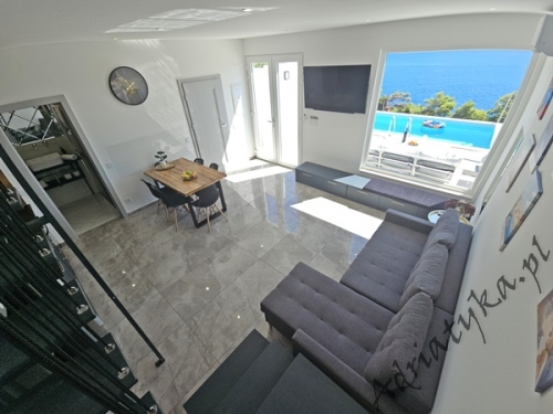 Luksusowy, bardzo ładny dom (75 m²) w którym może być zakwaterowane do 8 osób, kategoria ****, parter / pierwsze piętro, basen (15 m²), klimatyzacja x 3, TV x 3, internet, trzy sypialne, bardzo duży pokój dzienny połączony z kuchnią i jadalnią (wyjście taras), dwie łazienki, pralka, suszarka do ubrań, żelazko, deska do prasowania, suszarka do włosów, prywatny parking, grill, bardzo duży tarasy (45 m², obok basenu) z pięknym widokiem na morze, leżaki, parasole, prysznic ogrodowy, meble ogrodowe, stół i krzesła na tarasie, palenie wewnątrz domu nie jest dozwolone (palenie jest preferowane na tarasie).