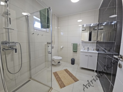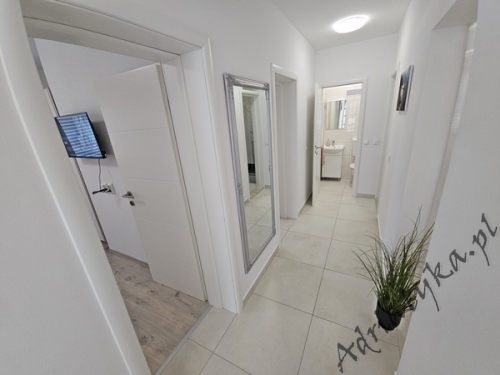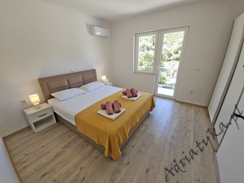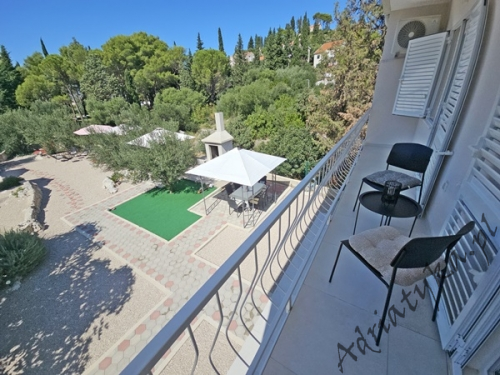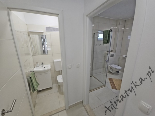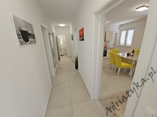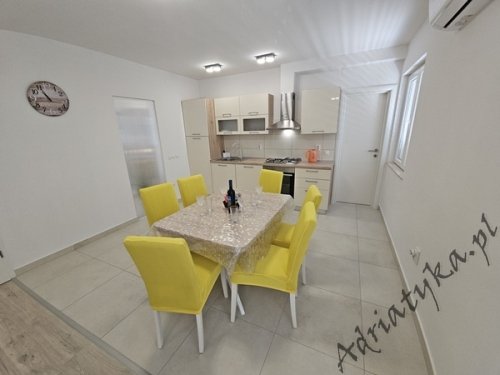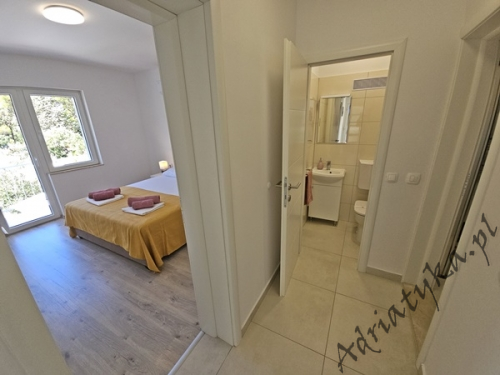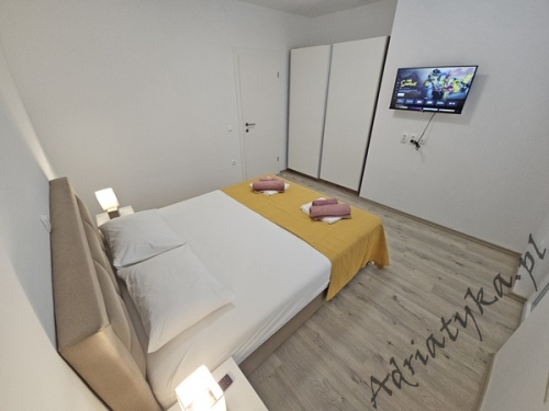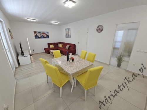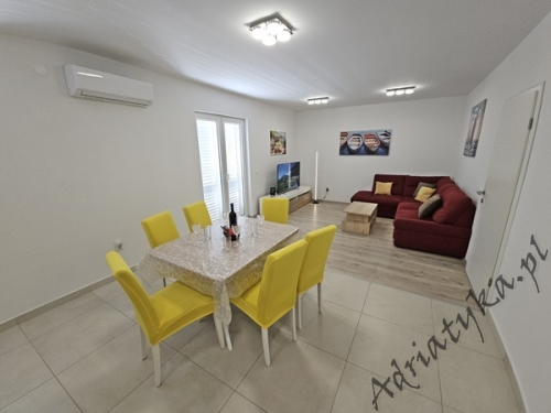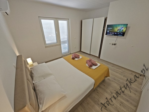Cena od: 50€ za dobę* * podana cena jest ceną minimalną. Pełny cennik na dole oferty. Informacje dotyczące kwatery Bardzo ładny, duży apartament (75 m²) w którym może być zakwaterowane do 5 osób, kategoria ***, pierwsze piętro, potrójna klimatyzacja (w każdym pokoju), internet, TV x 3, TV-SAT, dwie sypialnie (obie z wyjściem na balkon), ładna kuchnia połączona z jadalnią i pokojem dziennym (wyjście na balkon), bardzo ładna łazienka, toaleta, korytarz, pralka, żelazko, deska do prasowania, suszarka na pranie, dwa balkony (jeden z widokiem na morze), bardzo duży ogród (300 m²), stoły i krzesła + leżaki na balkonach i w ogrodzie, meble ogrodowe, parasole, grill, prysznic ogrodowy, prywatny parking, palenie w apartamencie nie jest dozwolone (palenie jest dozwolone na tarasie lub w ogrodzie). Wyposażenie kuchni: naczynia do przygotowywania i serwowania jedzenia i napojów, sztućce w odpowiedniej ilości, zmywarka, elektryczno-gazowa kuchnia, duża lodówka (135 L), zamrażarka (35 L), czajnik elektryczny, mikrofalówka, ekspres do kawy, toster, piekarnik, okap kuchenny. Wyposażenie łazienki: kompletne, kabina z prysznicem, suszarka do włosów. Wyposażenie toalety: umywalka, sedes. Zwierzęta domowe mile widziane (usługa dodatkowo płatna 5€ za dobę). Informacje o pokojach Ilość pokoi: 2 + pokój dzienny, łączna liczba łóżek w pokojach: 3, łączna liczba łóżek dwuosobowych: 2, liczba łóżek jednoosobowych: 1 (łóżko znajduje się w pokoju dziennym, rozkładana sofa). Odległości Odległość do przystanku autobusowego 500 m, odległość do stacji kolejowej 140 km (Split), odległość do najbliższego portu lotniczego 160 km Split (Trogir), odległość do przystani promowej 300 m, odległość do hałaśliwej (ruchliwej) ulicy 500 m, odległość do kantoru 300 m, odległość do bankomatu 300 m, odległość do restauracji 200 m, odległość do sklepu 60 m, odległość do najbliższej stacji benzynowej 10 km. PlażaBardzo ładna żwirowa i kamienista plaża, oddalona od obiektu o 100 m, odległość do morza wynosi 120 m. W najbliższej okolicy znajduje się wiele innych, bardzo ładnych plaż. Inne uwagi Apartament znajduje się na pierwszym piętrze ładnego domu. Budynek usytuowany jest blisko od plaży (około 100 m). Goście mają do dyspozycji internet, dwa balkony (jeden z widokiem na morze), bardzo duży ogród, stoły i krzesła + leżaki na balkonach i w ogrodzie, meble ogrodowe, parasole, prysznic ogrodowy, prywatny parking oraz murowany grill, na którym można przygotować rybne i mięsne specjały dalmatyńskiej kuchni przy kieliszku dobrego, domowego wina i rakiji. Internet: usługa wliczona w cenę wynajmu. Cennik