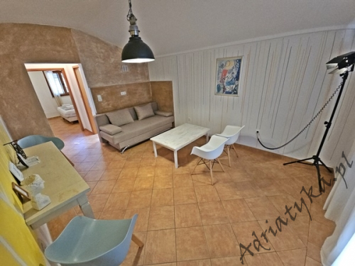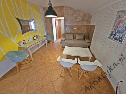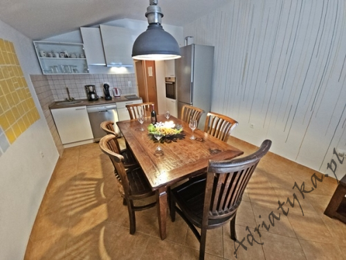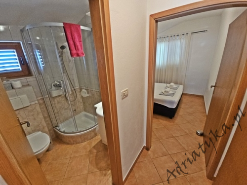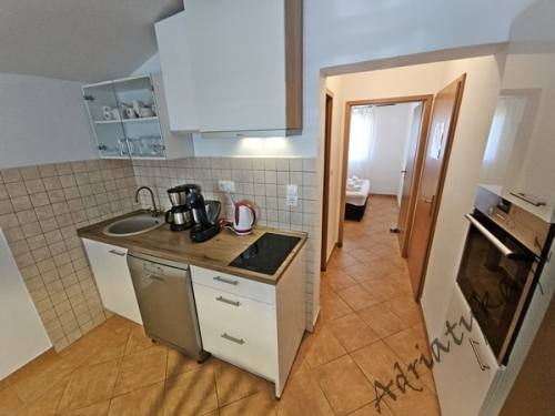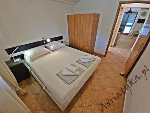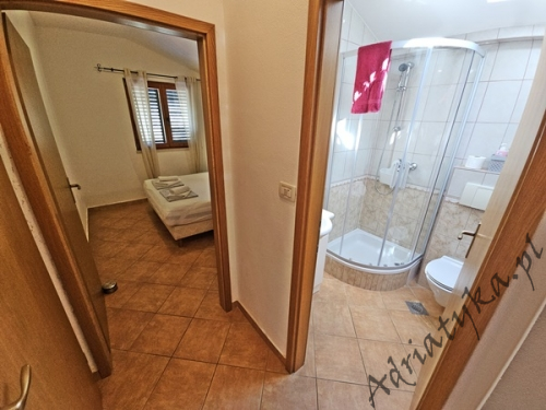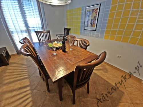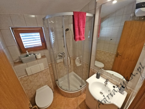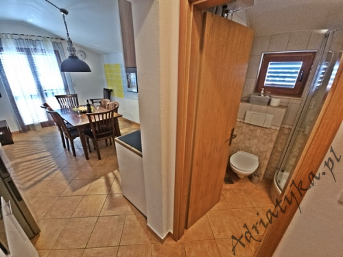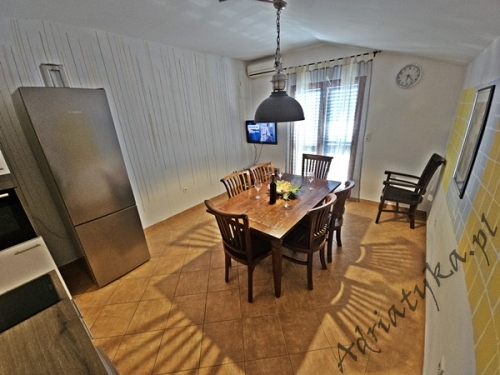 Bardzo ładny, duży apartament (73 m²) w którym może być zakwaterowane do 5 osób, kategoria ***, drugie piętro, podwójna klimatyzacja, internet, TV x 2, TV-SAT, dwie sypialnie, ładna kuchnia połączona z jadalnią (wyjście na balkon), ładny pokój dzienny (wyjście na balkon), dwie ładne łazienki, żelazko, deska do prasowania, suszarka na pranie, odkurzacz, dwa balkony (2 x 3 m²), piękny widok na morze, duży i zadaszony taras (20 m²), stoły i krzesła na tarasie i balkonach, elektryczny grill, prywatny parking, palenie w apartamencie nie jest dozwolone (palenie jest dozwolone na tarasie i balkonach).