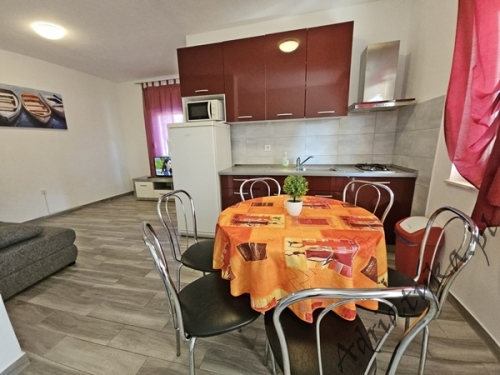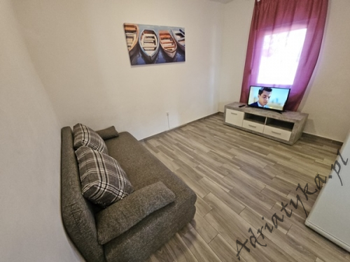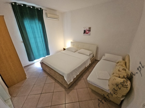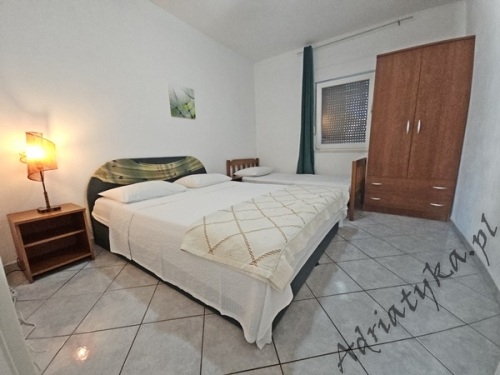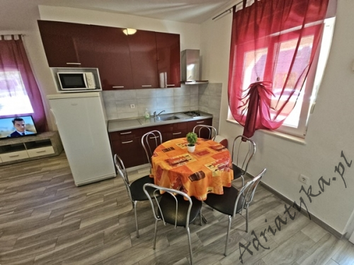 Bardzo ładny, duży apartament (80 m²) w którym może być zakwaterowane do 8 osób, kategoria ***, parter, internet, TV, klimatyzacja, duży basen 40 m², dwie sypialnie, pokój dzienny, ładna kuchnia połączona z jadalnią, dwie bardzo ładne łazienki, dwa (zadaszone) tarasy, duży słoneczny taras (obok basenu) z częściowym widokiem na morze, leżaki, plac zabaw dla dzieci, grill, duży prywatny parking (1000 m²), palenie w apartamencie jest dozwolone.