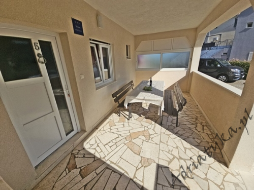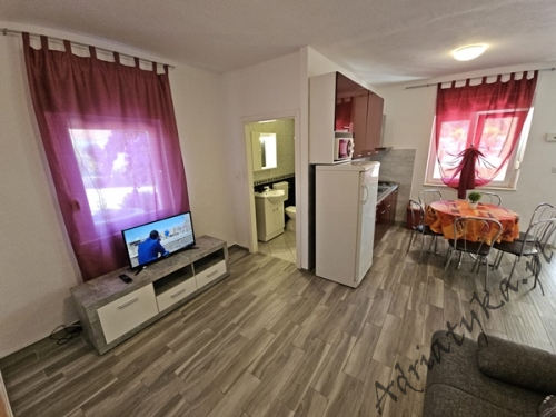Apartament znajduje się na parterze ładnego dużego budynku. Goście maja do dyspozycji internet, duży basen, leżaki, dwa tarasy, duży (słoneczny) taras z częściowym widokiem na morze (zieleń i sąsiednie budynki), mały plac zabaw dla dzieci, bardzo duży prywatny parking oraz grill, gdzie można przygotować rybne i mięsne specjały dalmatyńskiej kuchni przy kieliszku dobrego (domowego) wina i rakiji.